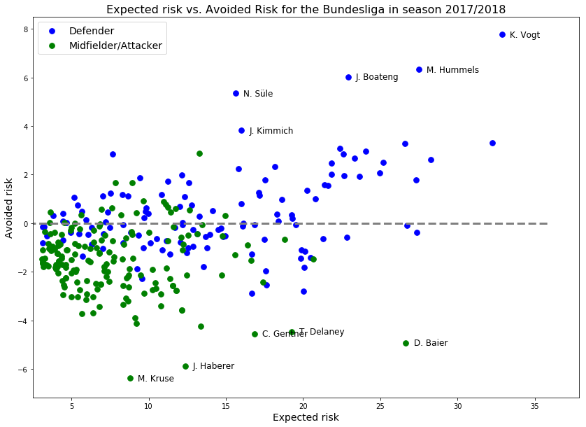 For Midfielders/Attackers we see that in absolute avoided risk, Hasebe is the strongest, while Thiago is actually posting very similar numbers when looking at the ratio between Avoided and Expected Risk. An impression that gets amplified looking at the results of the 2018/2019 season, in which Thiago is far and away the best player amongst Midfielders/Attackers and even makes it in the Top 5 of overall players in the Bundesliga.